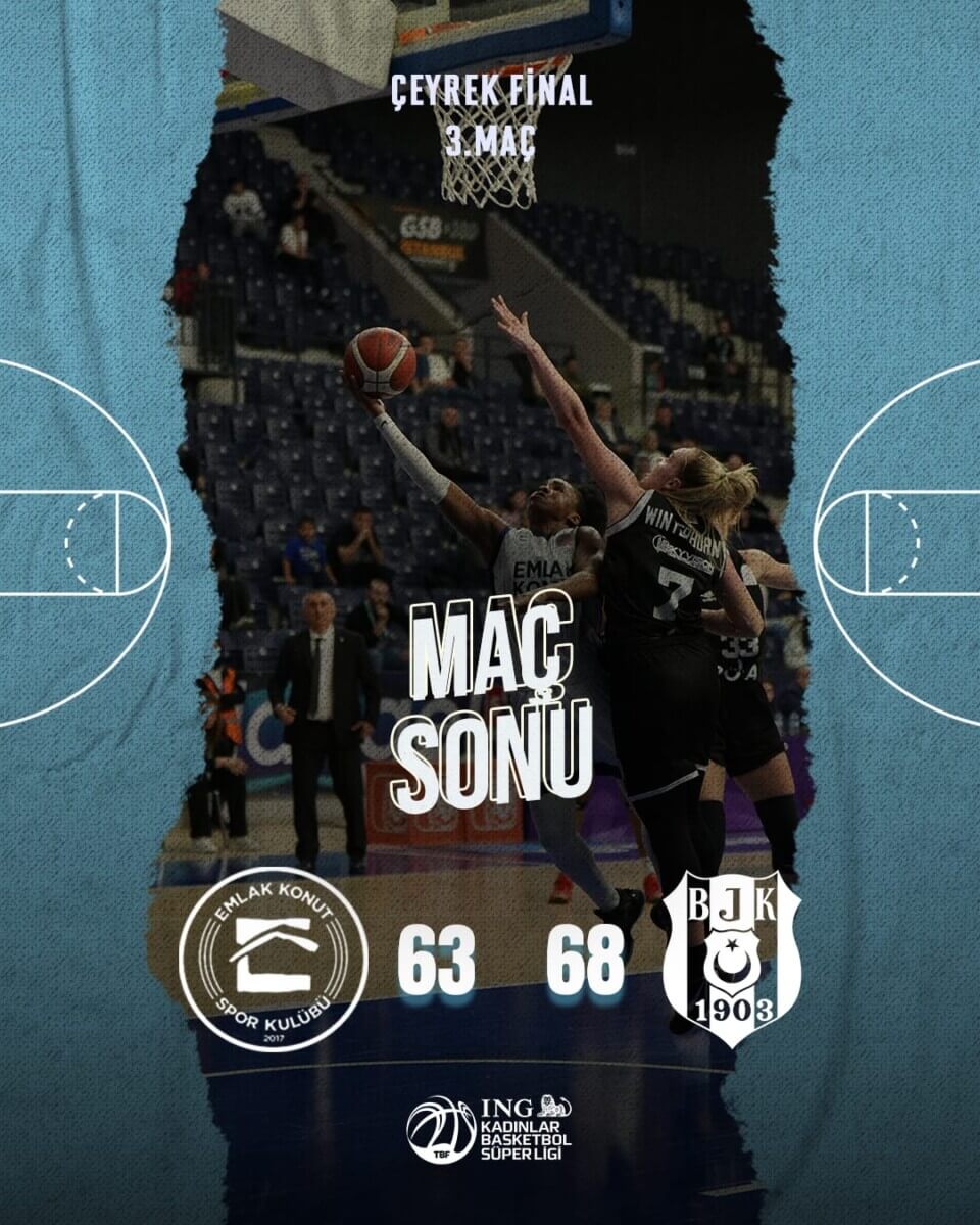 Emlak Konut Kadın Basketbol Takımımız, Beşiktaş BOA ile karşılaştı. ING Kadınlar Basketbol Süper Ligi play off eşleşmesi çeyrek final serisi üçüncü maçında 30 Mart Pazar günü saat 18:00’de Başakşehir Spor Kompleksi’nde parkeye çıkan Murat Alkaş’ın öğrencileri sahadan 68-63 yenik ayrıldı ve 2024-2025 sezonuna nokta koydu.